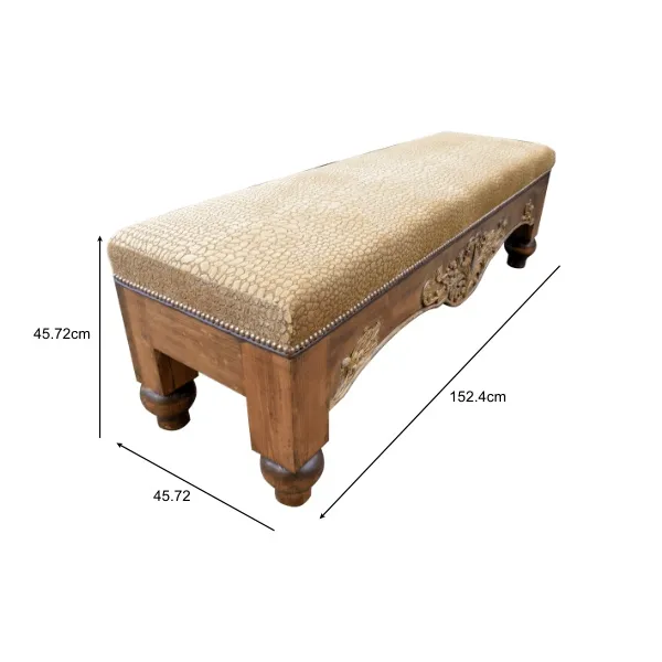 Asiento tapizado en tela texturizada beige: El asiento de la banca tradicional de madera está tapizado con piel color beige, que ofrece una superficie cómoda y acogedora. Esta piel no solo proporciona un contraste sutil con el marco de madera, sino que también complementa una variedad de esquemas de decoración. El color beige aporta una sensación de calidez y versatilidad, permitiendo que la banca se integre fácilmente en diferentes estilos decorativos, desde lo tradicional hasta lo contemporáneo.