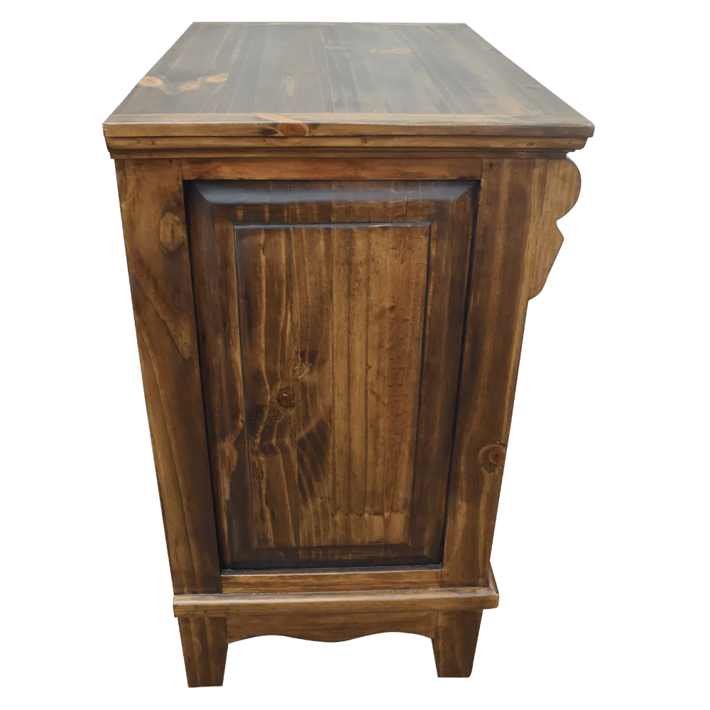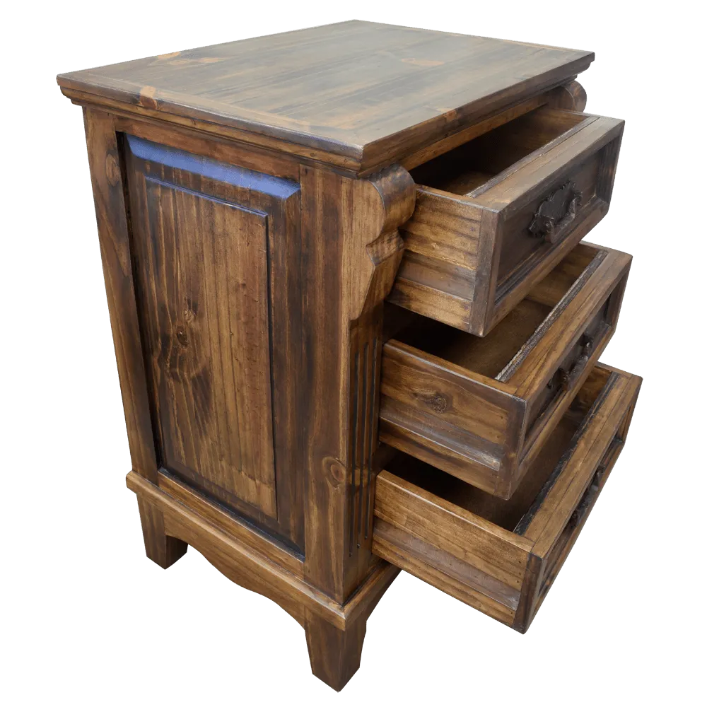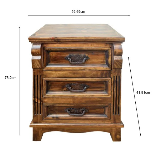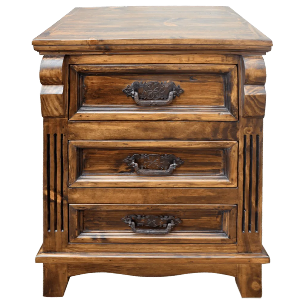 Equipado con tres cajones espaciosos, cada uno está adornado con tiradores de hierro forjado que presentan intrincados diseños ornamentales. Estos tiradores no solo ofrecen un acceso cómodo y práctico, sino que también aportan un toque de lujo y distinción al buró, destacando la artesanía en cada detalle.