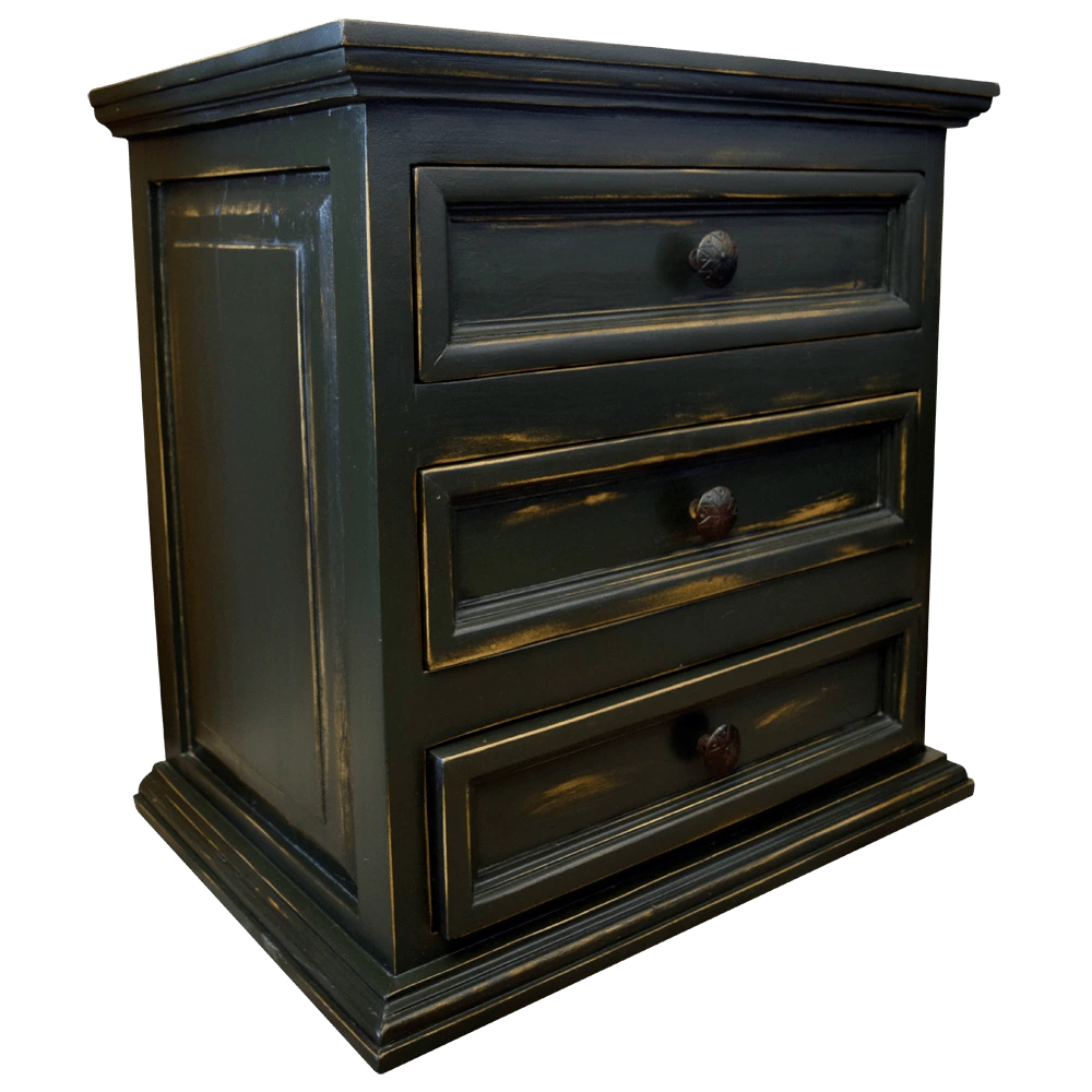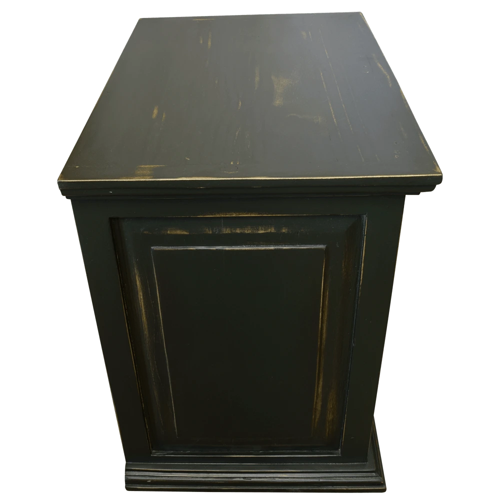 El acabado en madera negra no solo ofrece una base sólida y elegante, sino que los bordes desgastados cuidadosamente aplicados realzan su textura y le confieren una apariencia envejecida que evoca la historia y la autenticidad. Estos detalles desgastados crean un contraste fascinante que resalta la artesanía del buró y le da un toque vintage que encaja perfectamente en decoraciones tradicionales o rústicas.