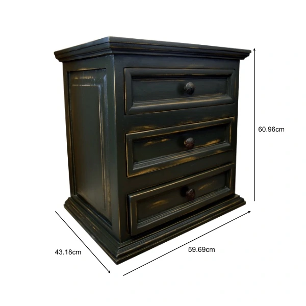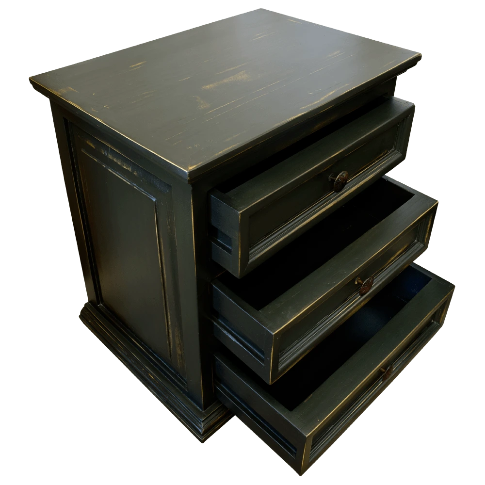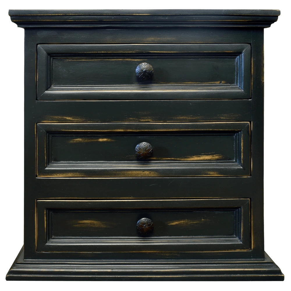 Este buró de madera negra de diseño clásico presenta un acabado en madera negra con bordes desgastados que realzan su textura y le dan un toque antiguo. Ideal para decoraciones de interiores con elementos vintage o rústicos, este buró combina elegancia y funcionalidad, convirtiéndose en una pieza central destacada en cualquier habitación. Cuenta con tres cajones con tirador metálico cada uno.