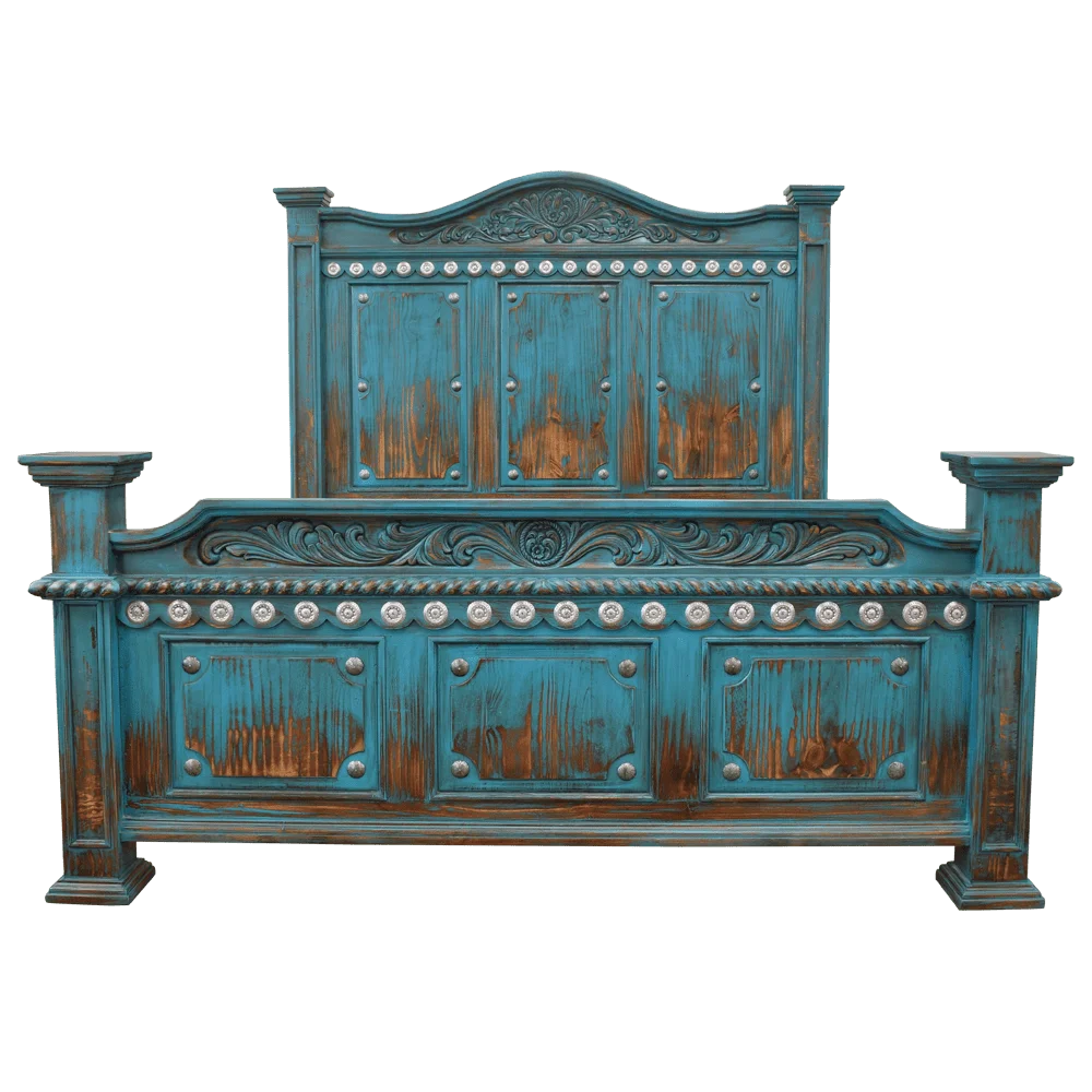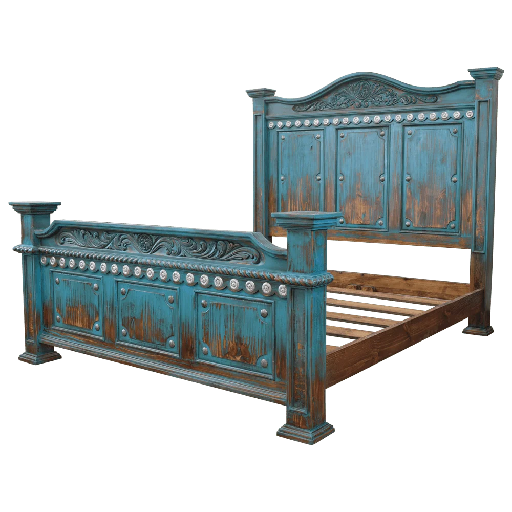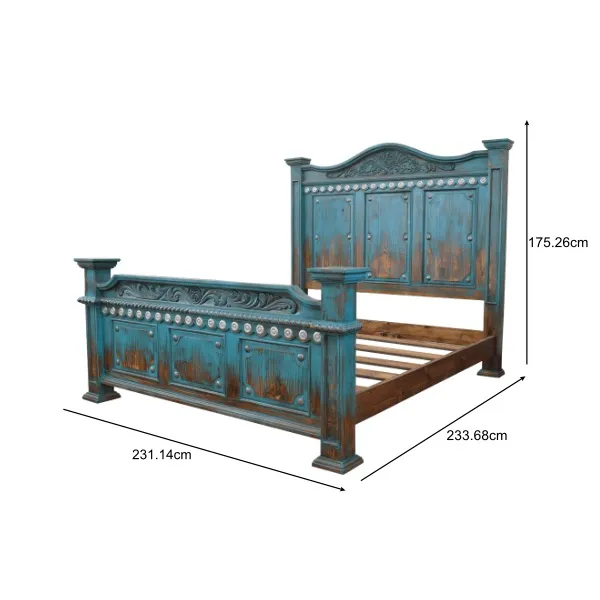 - Conchos metálicos adicionales: Debajo del tallado en la parte superior de la cabecera y del piecero, se encuentra una hilera de conchos más grandes. Estos conchos adicionales complementan el diseño y proporcionan un contraste llamativo con el color turquesa desgastado. La hilera de conchos agrega un toque de rusticidad y originalidad, creando una combinación perfecta entre lo clásico y lo contemporáneo.