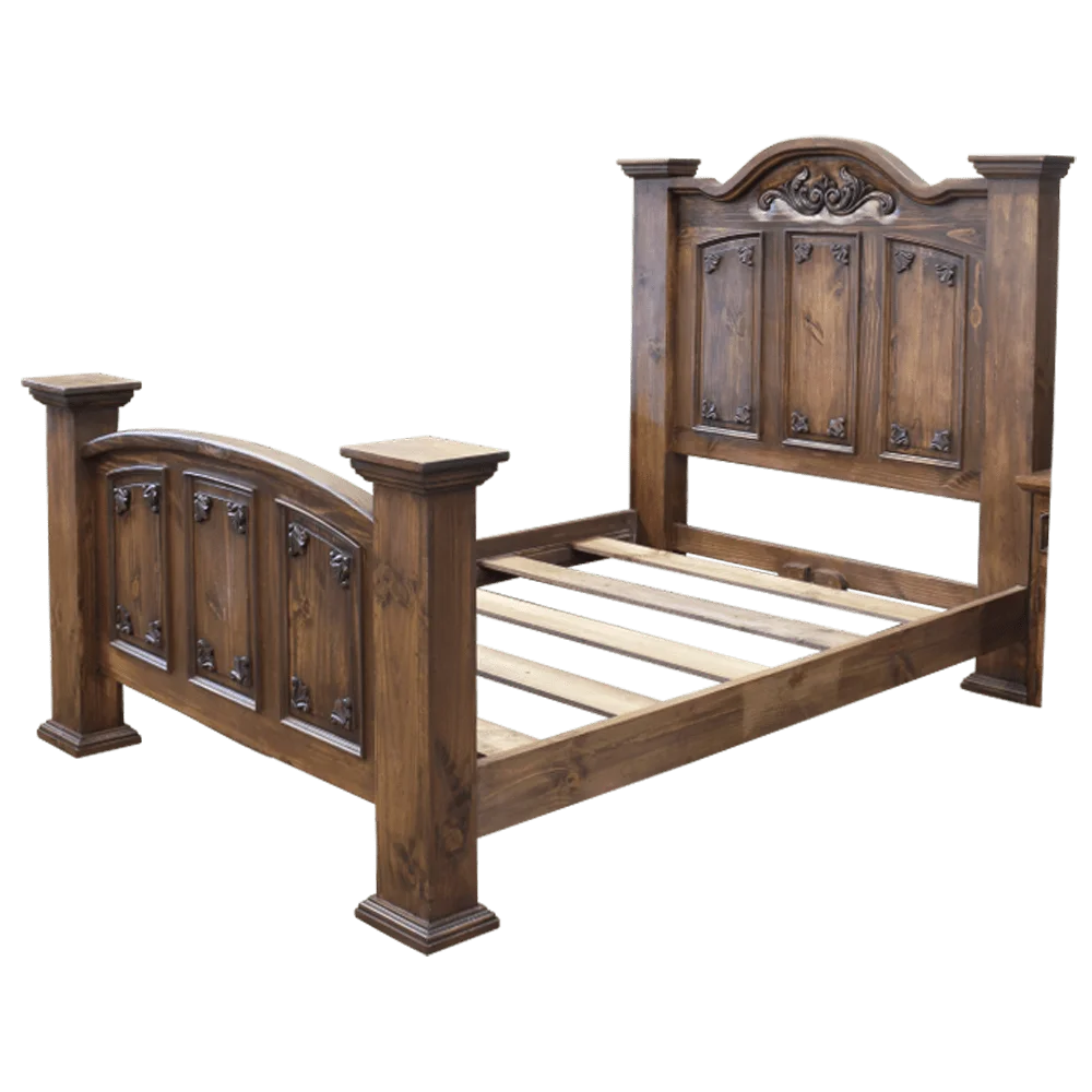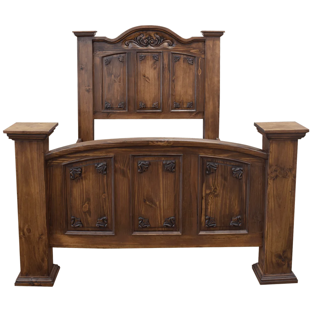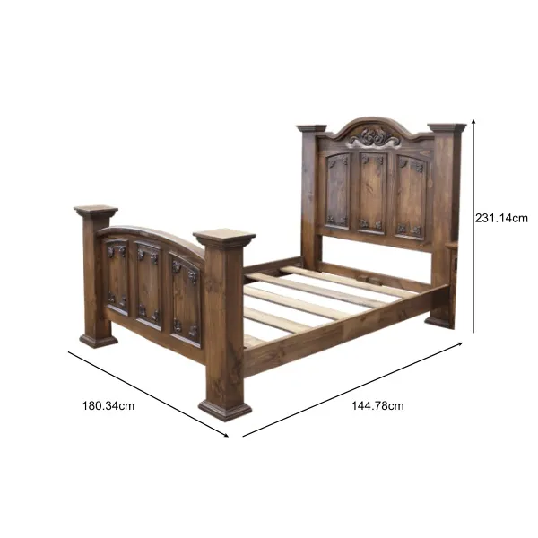 - Diseño: Cabecera y piecero con tres paneles cada uno, adornados con elegantes tallados en las esquinas y un tallado central más grande en la cabecera.