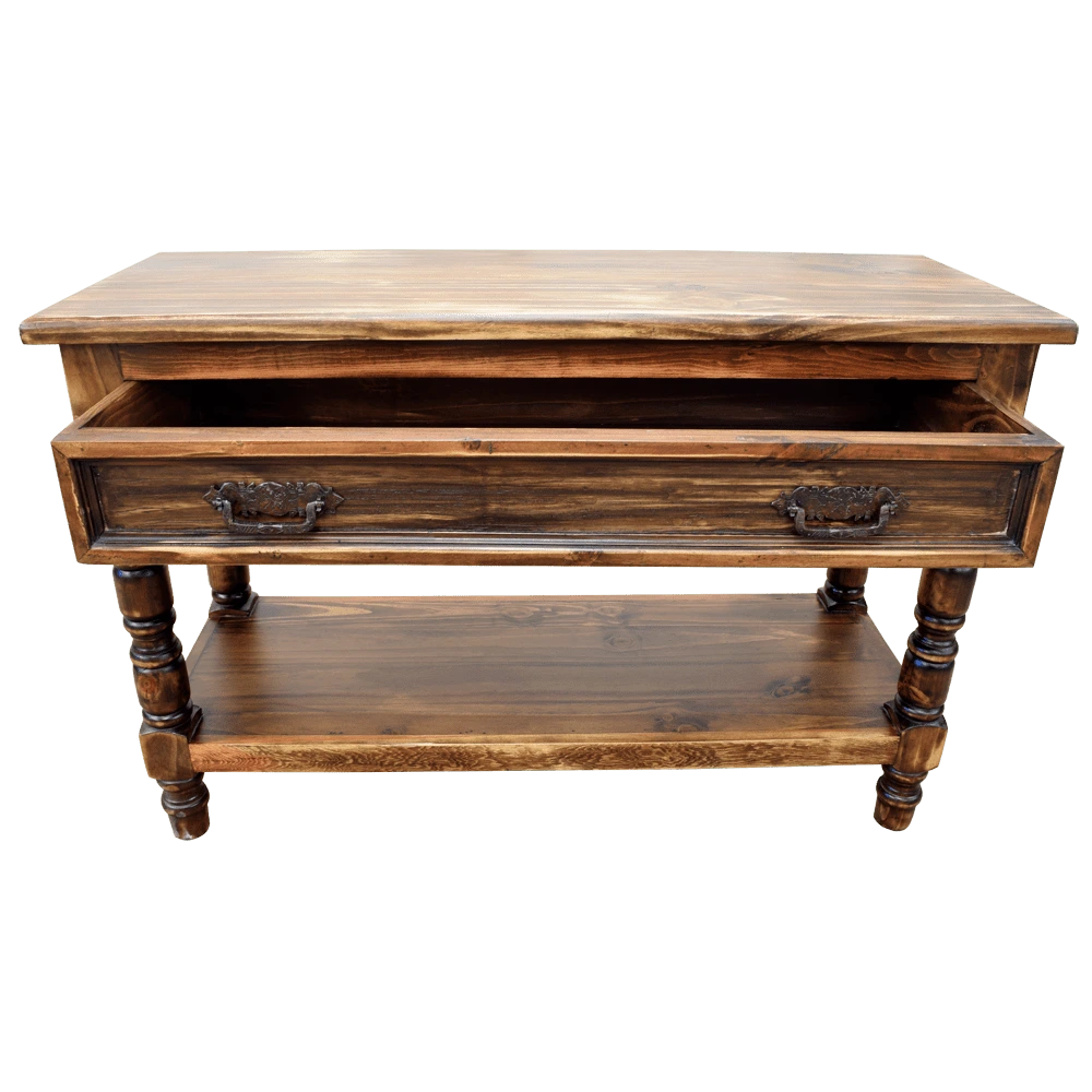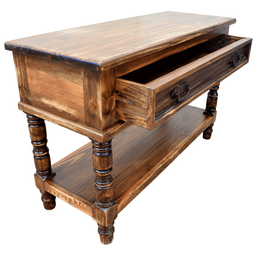 Añade un toque de elegancia a tu hogar con esta consola de madera de diseño clásico. Su tablero rectangular muestra patrones naturales de la veta de la madera, resaltando su acabado auténtico. La consola cuenta con un cajón con tiradores de metal ornamentales, ofreciendo almacenamiento práctico y estilizado. Las patas torneadas de la consola aportan una forma robusta y sofisticada, mientras que el estante inferior proporciona espacio adicional para almacenamiento o exhibición. Ideal para entradas, salas de estar o cualquier espacio que necesite un toque de distinción, esta consola combina funcionalidad y estética clásica.