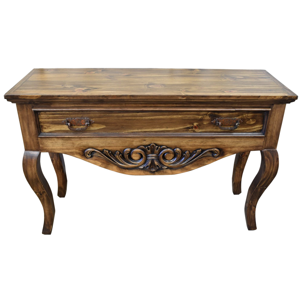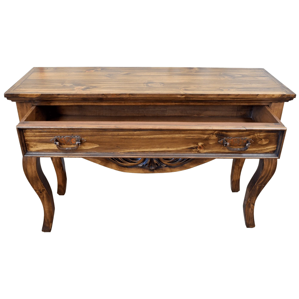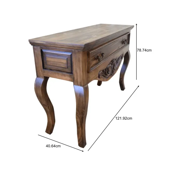 Añade un toque de elegancia a tu hogar con esta consola de madera de diseño clásico. Su tablero rectangular muestra patrones naturales de la veta de la madera, resaltando su acabado auténtico. La consola cuenta con un delantal tallado con diseños de hojas y volutas, y un cajón con tirador de metal, ofreciendo almacenamiento práctico y estilizado. Las patas curvas de la consola aportan una forma fluida y sofisticada, perfecta para interiores que buscan combinar funcionalidad y estética clásica. Ideal para salas de estar, entradas o cualquier espacio que necesite un toque de distinción.