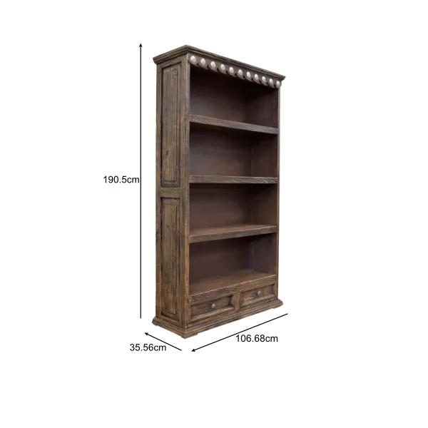 Este librero clásico de madera rústica presenta un diseño clásico con cinco estantes que ofrecen amplio espacio para libros o artículos decorativos. La parte superior del librero cuenta con una cornisa decorativa adornada con una fila de pequeños conchos redondeados ornamentales. Debajo de los estantes, hay dos cajones con dos perillas redondas cada uno para almacenamiento adicional.