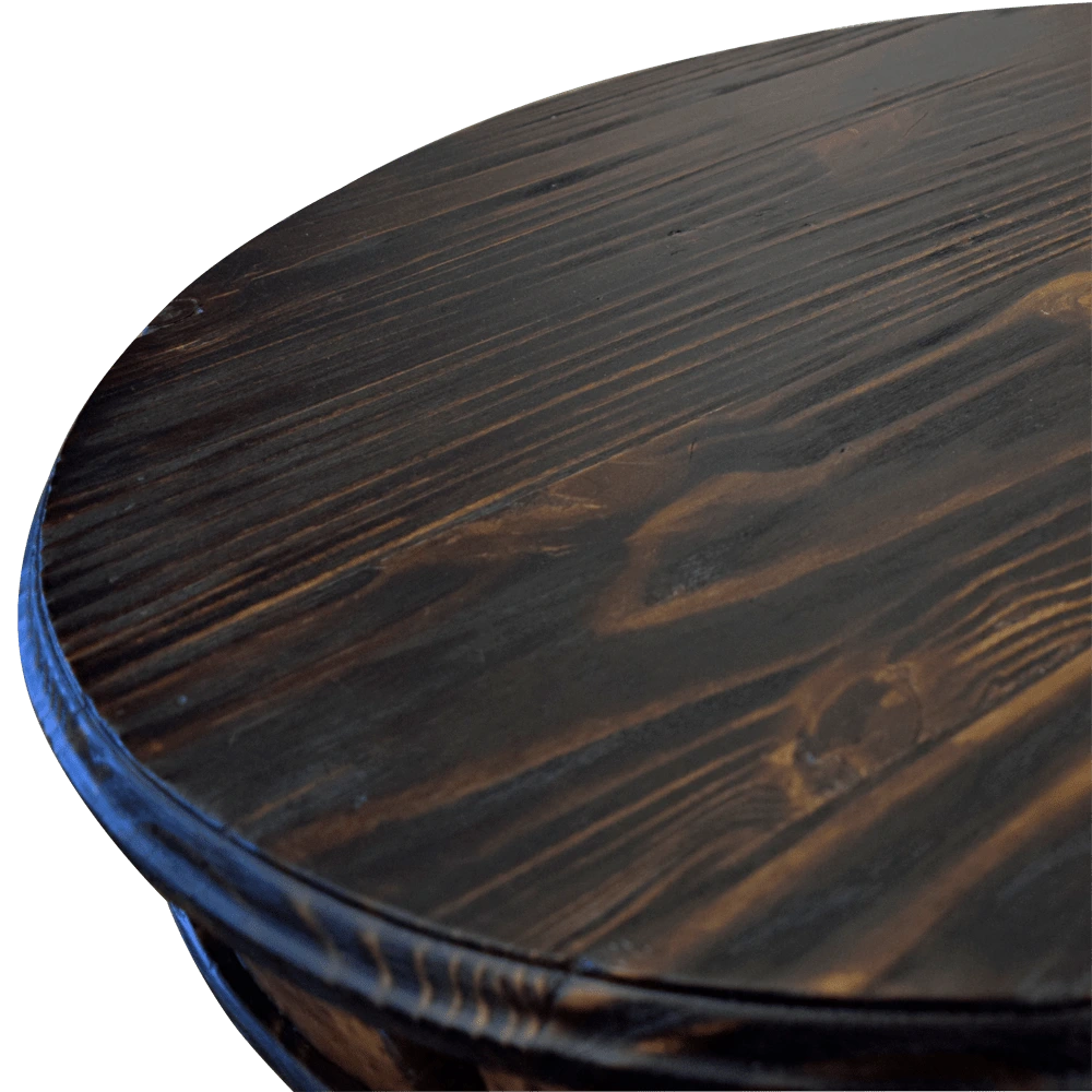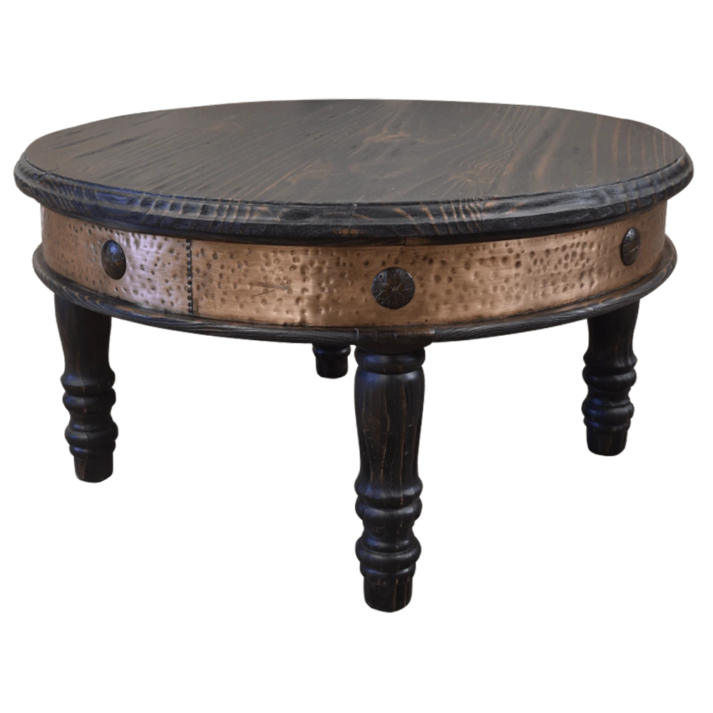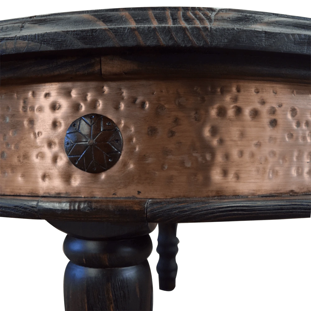 Alrededor del borde de la mesa, una banda distintiva de cobre con detalles martillados añade un toque de sofisticación rústica. Este acabado metálico no solo enriquece el diseño de la mesa con un contraste elegante contra la madera oscura, sino que también acentúa el estilo vintage de la pieza, haciendo que sea un punto focal en tu sala de estar.