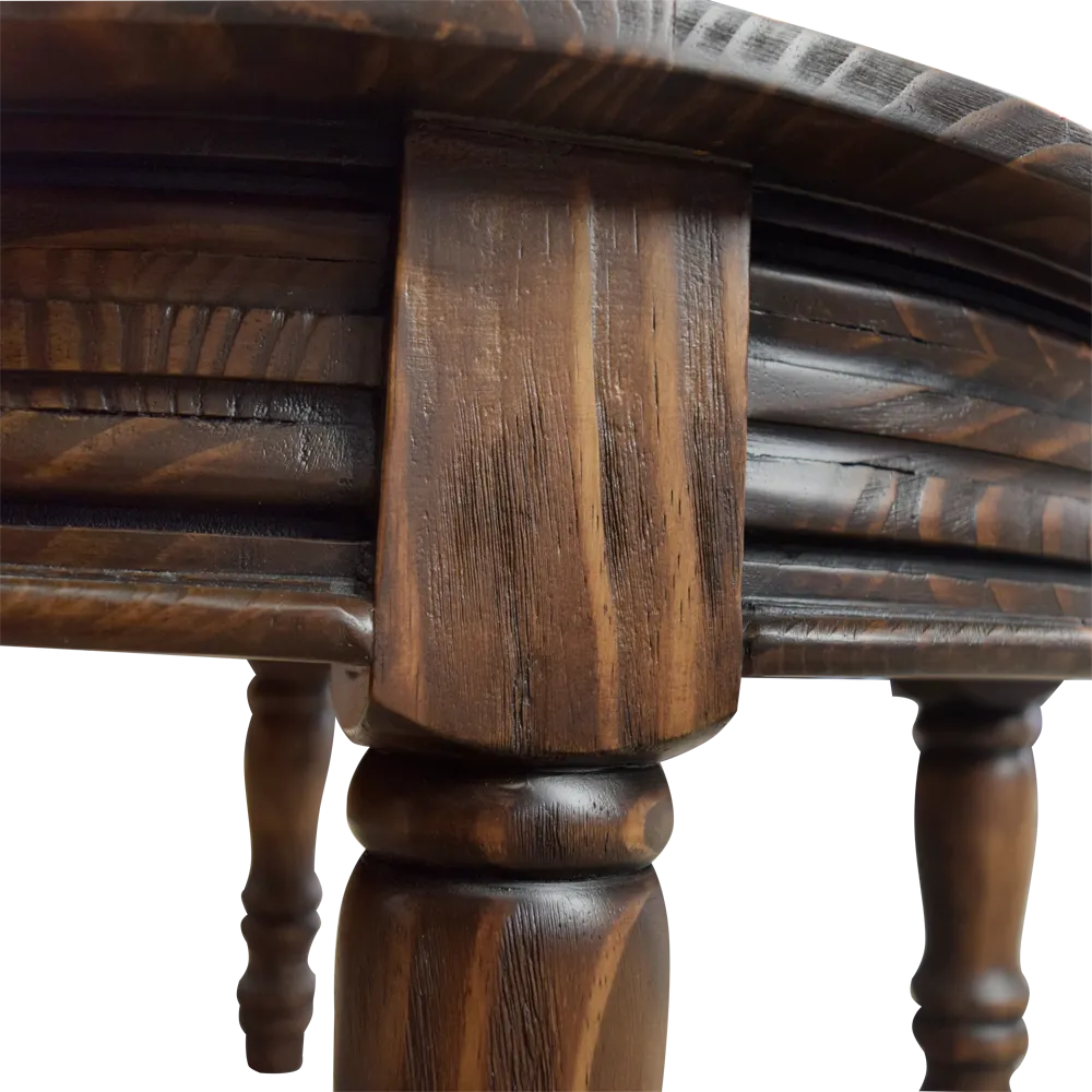 La estructura de la mesa se apoya en cuatro patas robustas torneadas que se estrechan hacia la base, una característica que no solo proporciona una estabilidad sólida, sino que también celebra una artesanía tradicional. Las patas torneadas aportan un aire clásico y elegante, asegurando que la mesa se mantenga firmemente en su lugar mientras añade un detalle decorativo encantador.