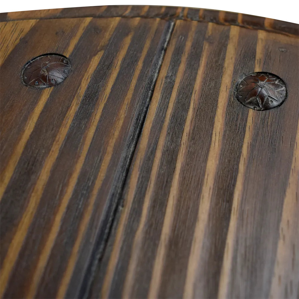 La superficie redonda de la mesa está meticulosamente diseñada con tonos variados de marrón que crean un efecto de profundidad y textura, convirtiéndola en un punto focal atractivo en cualquier habitación. El borde del tablero, ligeramente elevado, no solo define la forma de la mesa con un acabado pulido, sino que también añade un toque de sofisticación y distinción a su diseño.