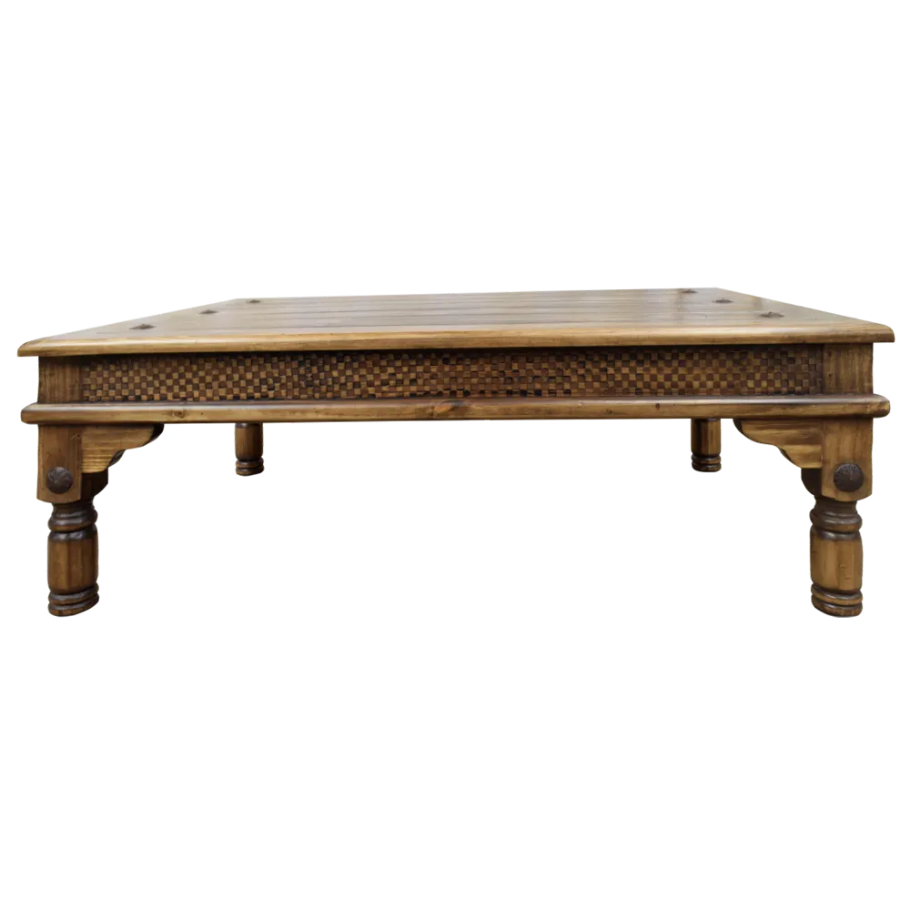 Esta mesa de centro rústica con estante presenta un acabado de vetas naturales de la madera que muestra nudos y variaciones en el color, añadiendo encanto y carácter. El tablero está compuesto por tablones colocados uno al lado del otro, creando un efecto de rayas. Debajo del tablero, hay un estante intrincado de mimbre tejido, que añade funcionalidad y atractivo estético. La mesa está sostenida por cuatro patas torneadas, gruesas y robustas, que proporcionan estabilidad a la estructura.