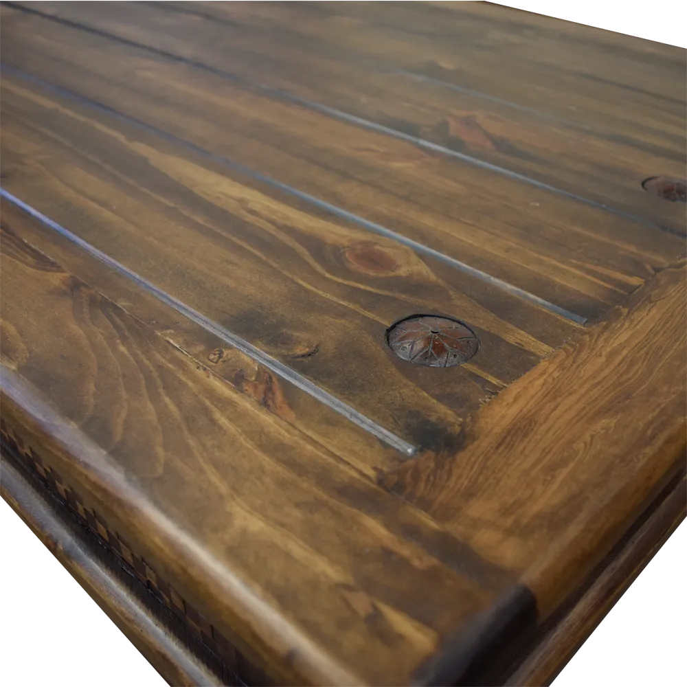 • Tablero de tablones: El tablero de la mesa está compuesto por tablones colocados uno al lado del otro, creando un atractivo efecto de rayas que acentúa la textura y la belleza del grano de la madera. Este detalle añade una dimensión visual interesante y un toque distintivo al diseño.