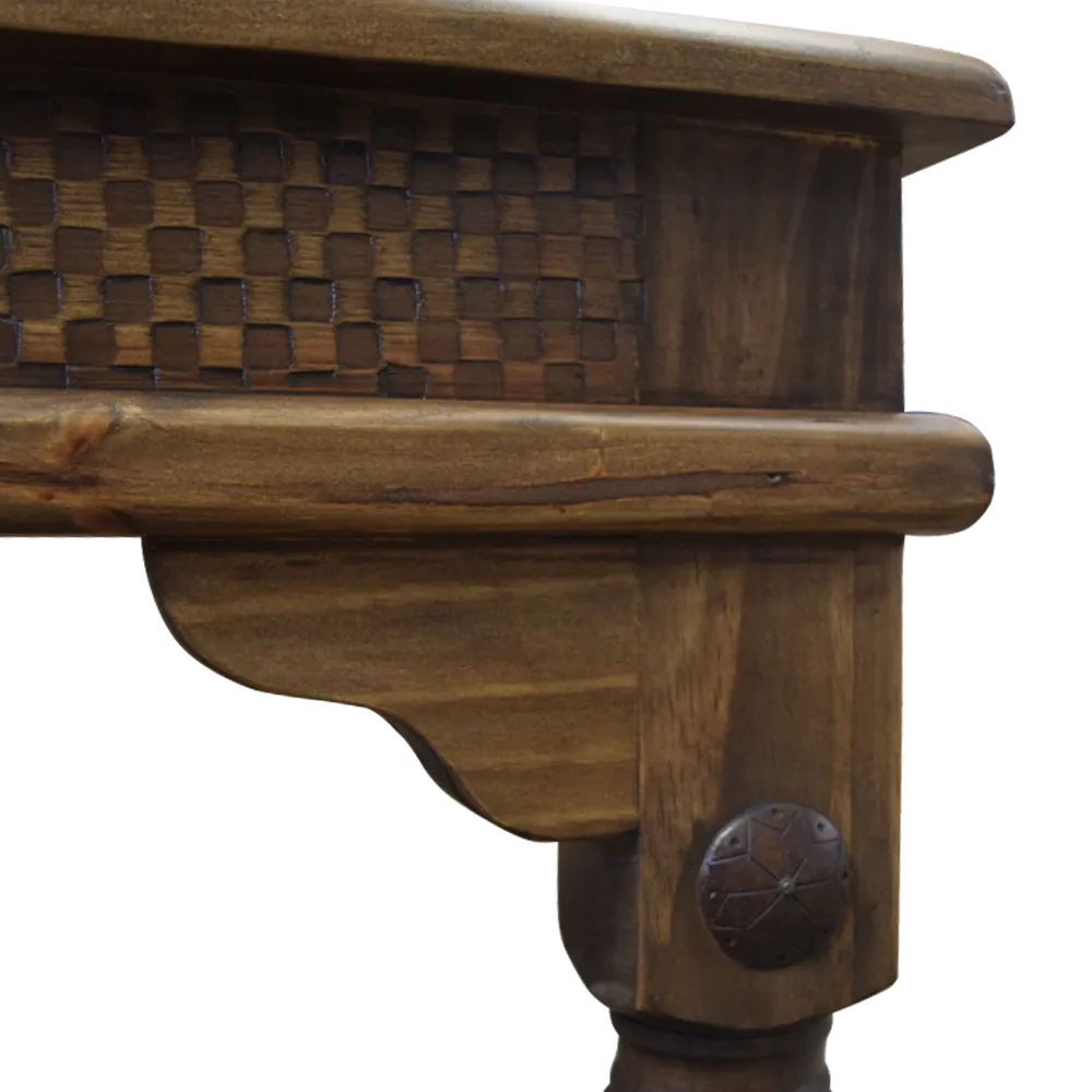 • Estante de mimbre tejido: Debajo del tablero, un estante intrincado de mimbre tejido ofrece funcionalidad adicional y un atractivo estético. Este estante es ideal para almacenar revistas, libros, o elementos decorativos, proporcionando una solución práctica y elegante para mantener el área ordenada.